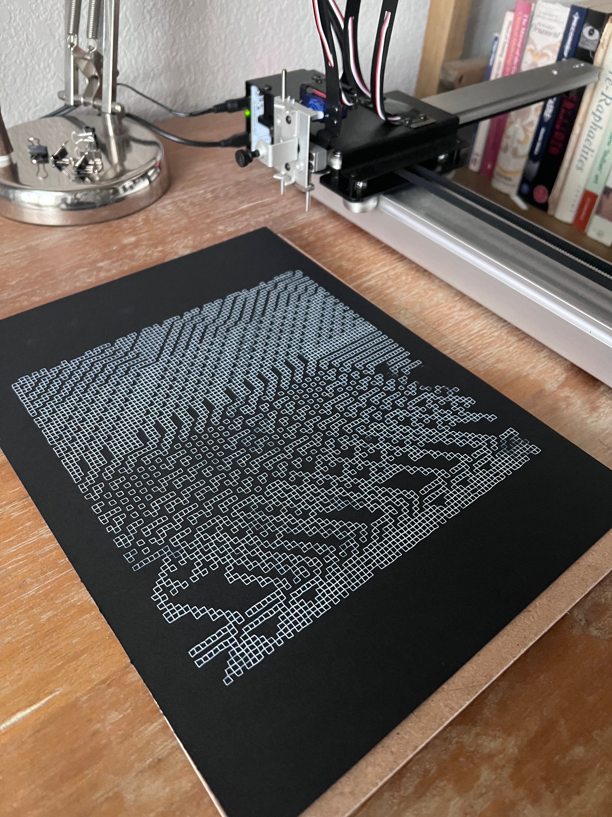 Each piece is made on demand. If you place an order and want an artist led piece, you do not need to do anything else. I will create a one of a kind drawing from the series and plot it to paper. If you prefer to discuss choices such as paper and color palette, contact me after checkout and I will hold plotting until we confirm. You can reach me through the contact page or on Twitter at @Pixel0Symphony.